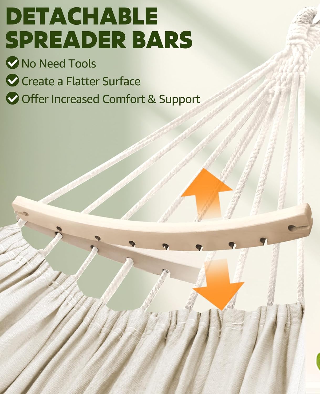 - Stability and Security:The spreader bars enhance stability, preventing excessive swaying or flipping,ensuring a secure and safe experience,especially when entering or exiting the hammock. With the included suspension system comprising two infinitely adjustable straps and two carabiners, you can easily and securely set up the hammock,promoting safe and enjoyable lounging.The suspension system's carabiners further enhance safety by offering reliable and secure attachment points.