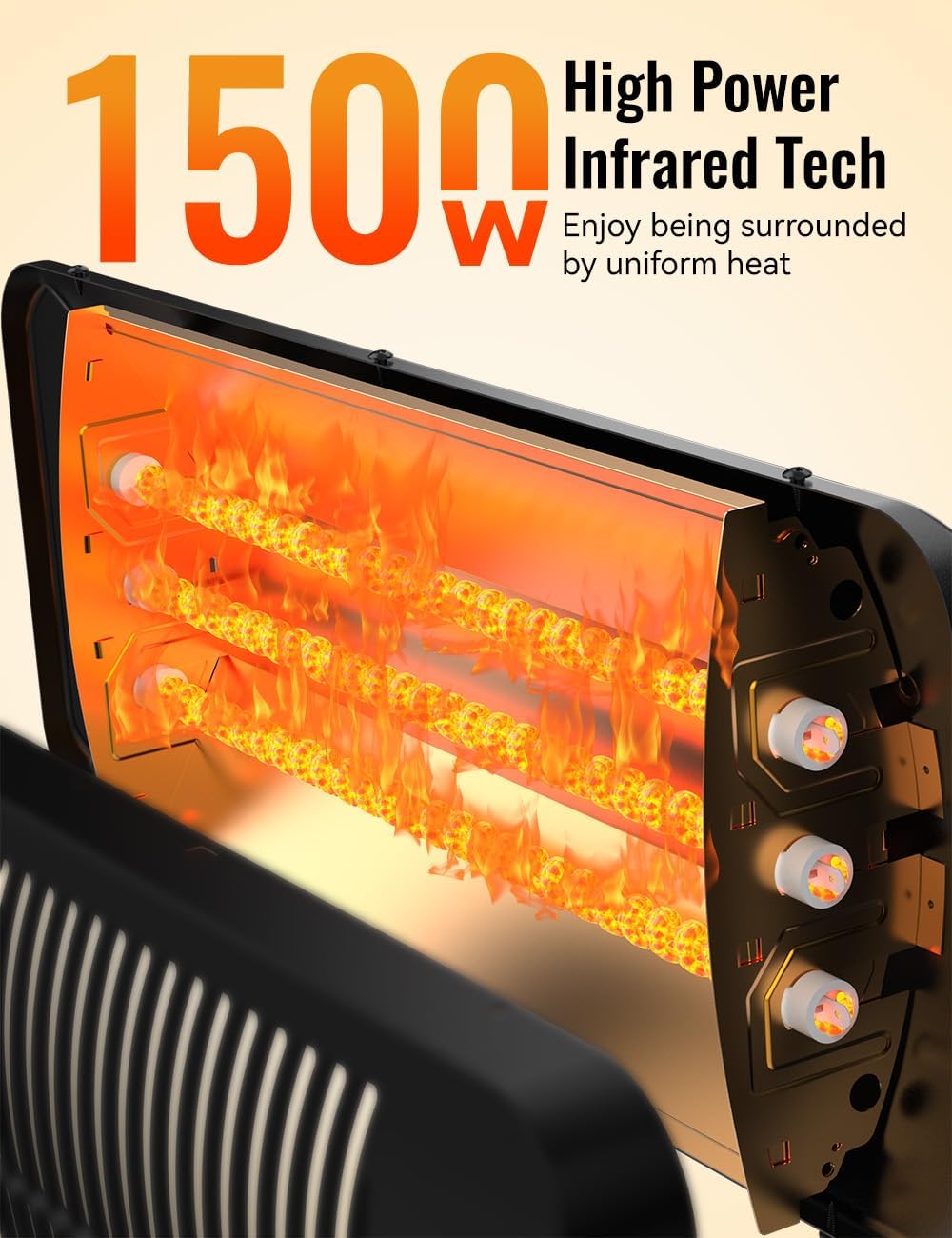 - đ„ă12H Smart Timer & Noise FreeăEasily set the heating duration with 12H timer. Before bedtime, put the electric patio heater to auto shut off after you fall asleep, ensuring safety all night and saving energy. During outdoor parties, set it to turn off after the event ends, guaranteeing safety and energy savings even if you forget to turn it off. The room heater runs silently! Only infrared heating without blowing noise, perfect for providing a quiet rest or work space.