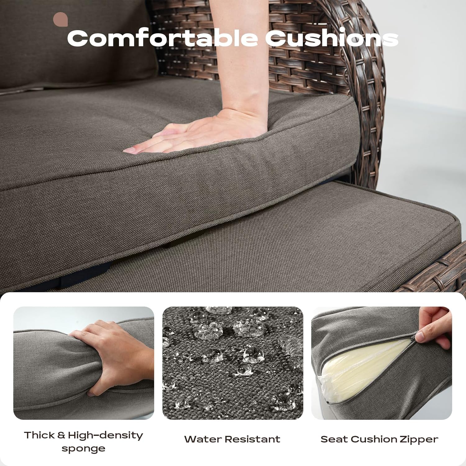 - Built to Last : This outdoor patio conversation set is constructed with hand woven with all-weather PE Rattan & powder-coated steel frame to make the outdoor seating set sturdy and durable for a long lasting outdoor use.