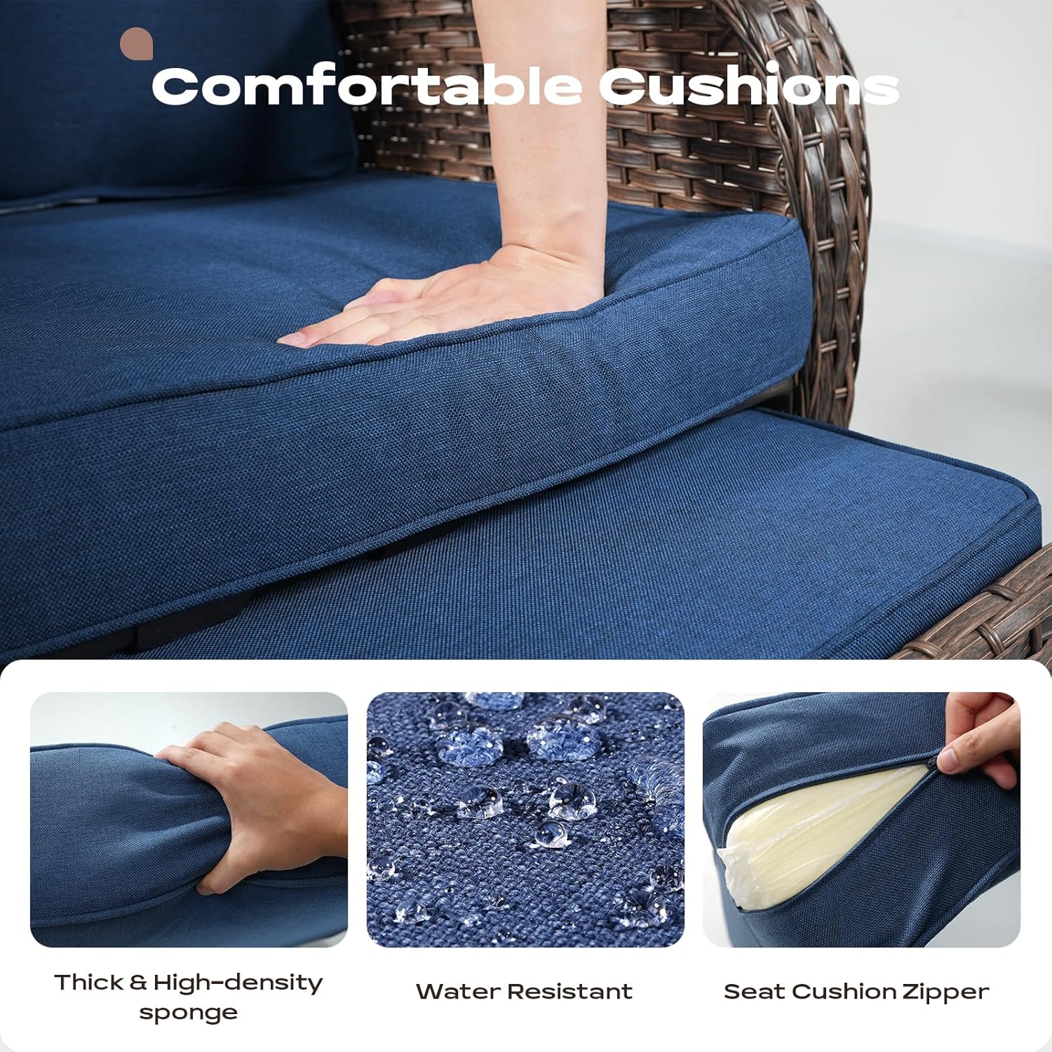 - Built to Last : This outdoor patio conversation set is constructed with hand woven with all-weather PE Rattan & powder-coated steel frame to make the outdoor seating set sturdy and durable for a long lasting outdoor use.