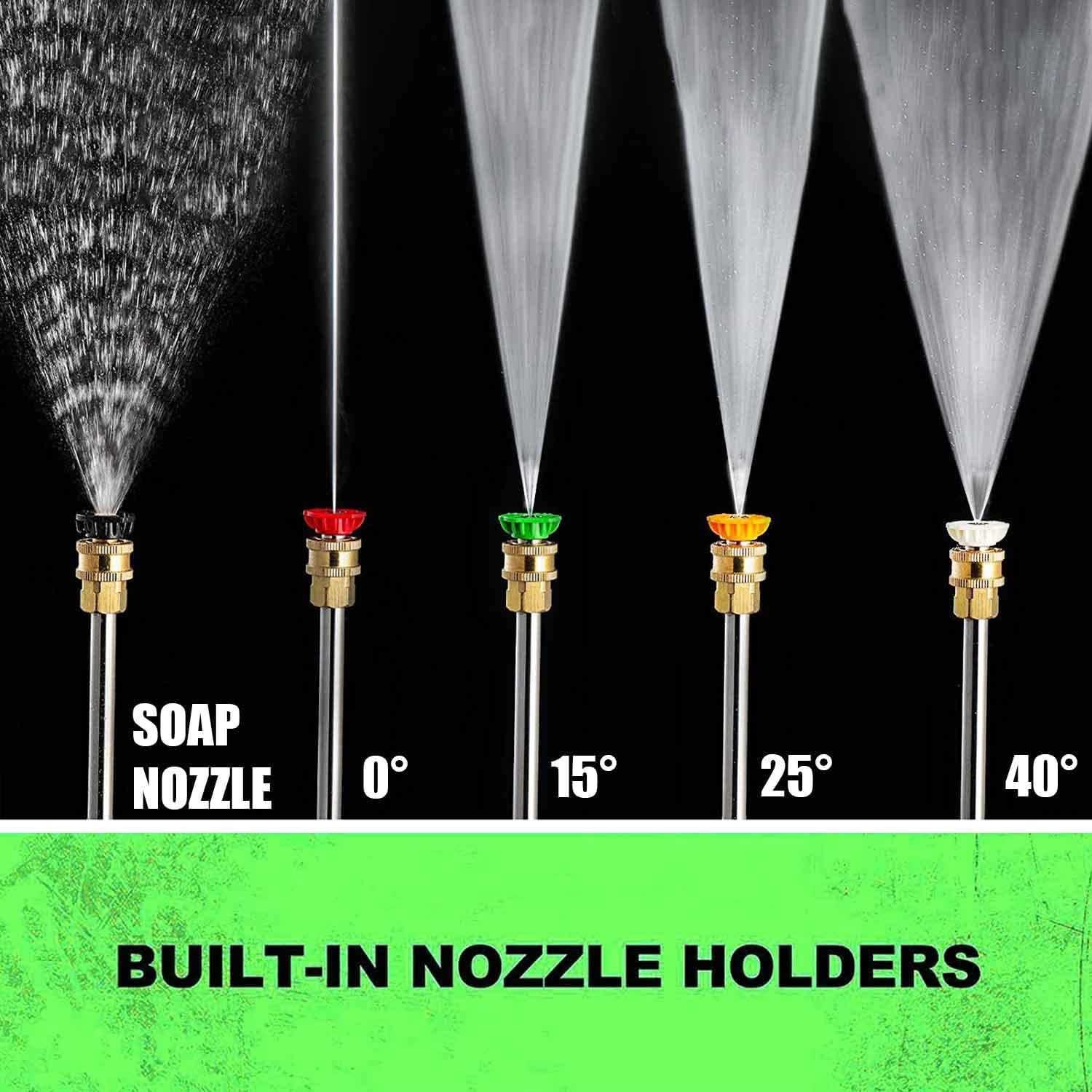 - Versatile Nozzles for Every Job, Every Surface! Choose the perfect spray angle with our specialized nozzles – designed for all surfaces! The 0° tip powers through the toughest messes, 15° for concrete, 25° for wood and siding, 40° for delicate surfaces, and a black tip to get rich, soapy bubbles for car washing. Switch up and clean with precision!