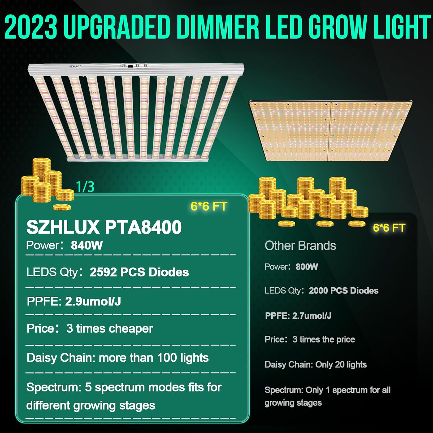 - 【High Efficiency and Low Energy Consumption】- SZHLUX LED Grow Light utilize the latest in high yielding LEDs technology diodes, high Energy Efficiency with 2.9 Umol/J, delivers powerful light output and uniform canopy penetration to resulting maximum higher yields. Actual power is 840W with 2592 LEDS, effective footprint is 7 x 7 ft.