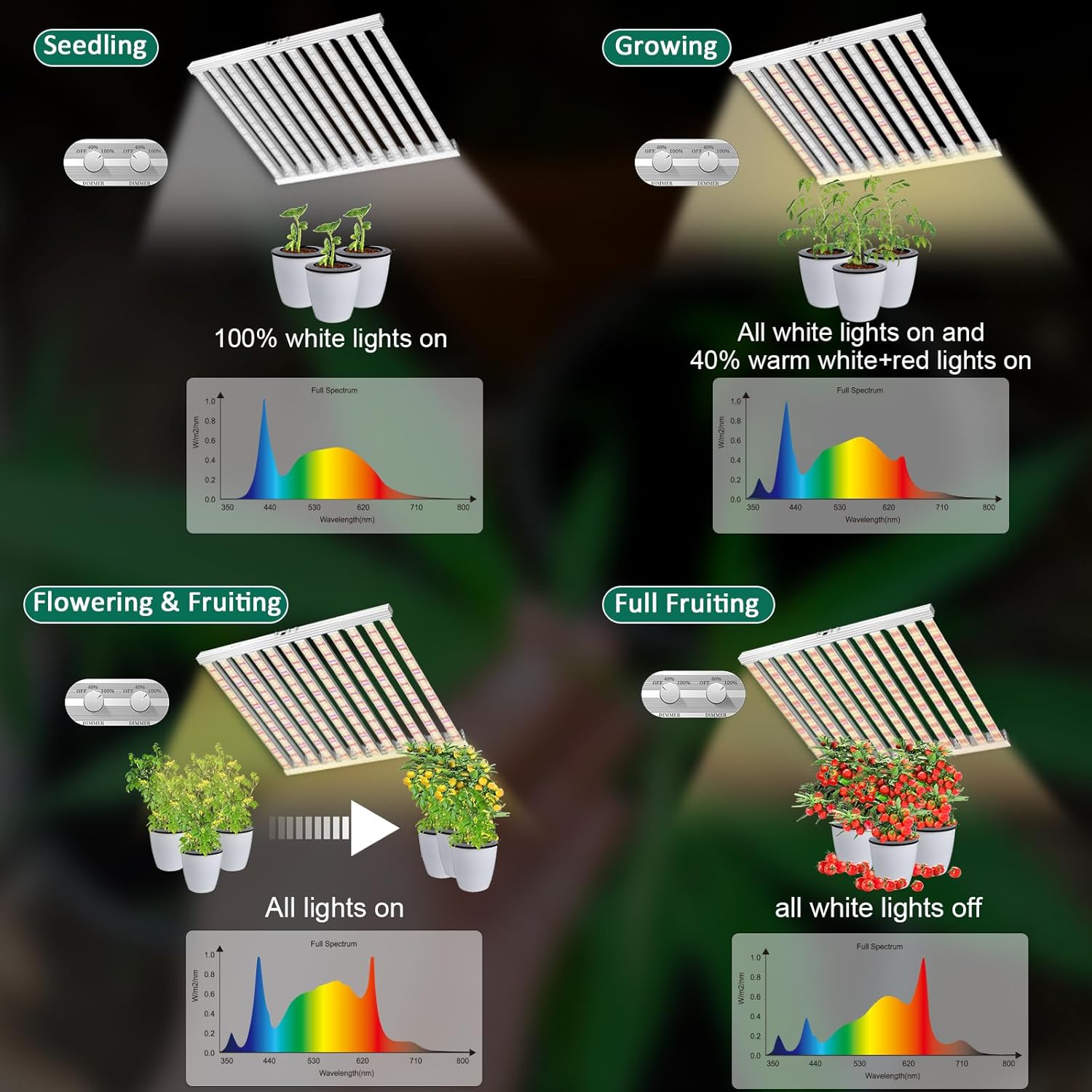 - 【Upgraded Dimmer Modes】- This upgraded light has 4 dimmer modes for different growing stage, plants will get absolutely full spectrum nutrition. If you turn to 40% for the first dimmer switch, 5 white light bars will on; If you turn to 100%, all white LEDs will on, it’s best for seedling and growing. If you turn to 40% for the 2nd dimmer switch, 4 light bars will on with warm white, red and IR LEDs; If you turn to 100%, all light bars will on, it’s most suitable for blooming and fruiting.