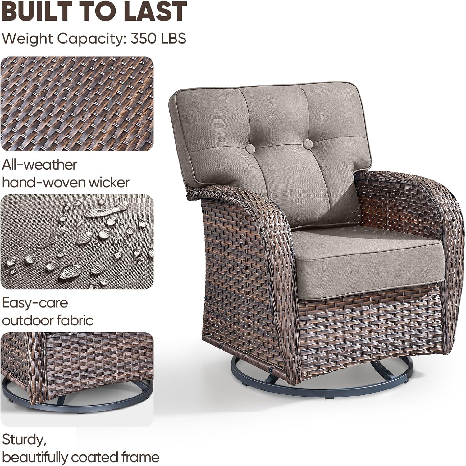 - 【Luxury T-shaped Wide Cushion】: This wicker rocking chair features a 31-inch-wide backrest. The 5-inch cushion on the outdoor rocking chair swivel chair is made of high-density 28D foam, perfectly balancing softness and support. Its quick-rebound properties ensure long-term shape retention and comfort. The backrest is filled with three-dimensional spaced cotton. The cushion cover is made of premium OLEFIN fabric, offering UV resistance, waterproofing, and fade resistance. Compared to ordinary polyester fabric, it is more comfortable and durable
