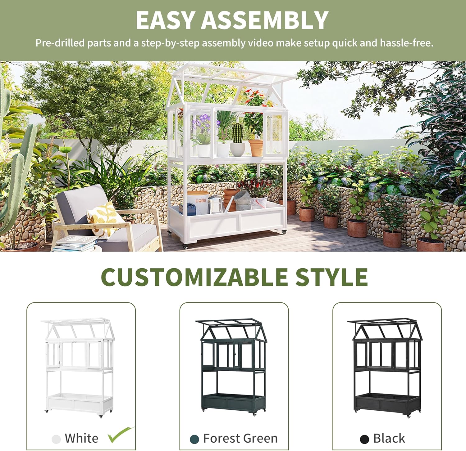- Easy Assembly & Customizable Style – Pre-drilled parts + step-by-step video make setup a breeze. Available in 3 elegant colors (forest green, white, black) to match any outdoor decor. Tool-free roof adjustment and ergonomic handles enhance usability.
