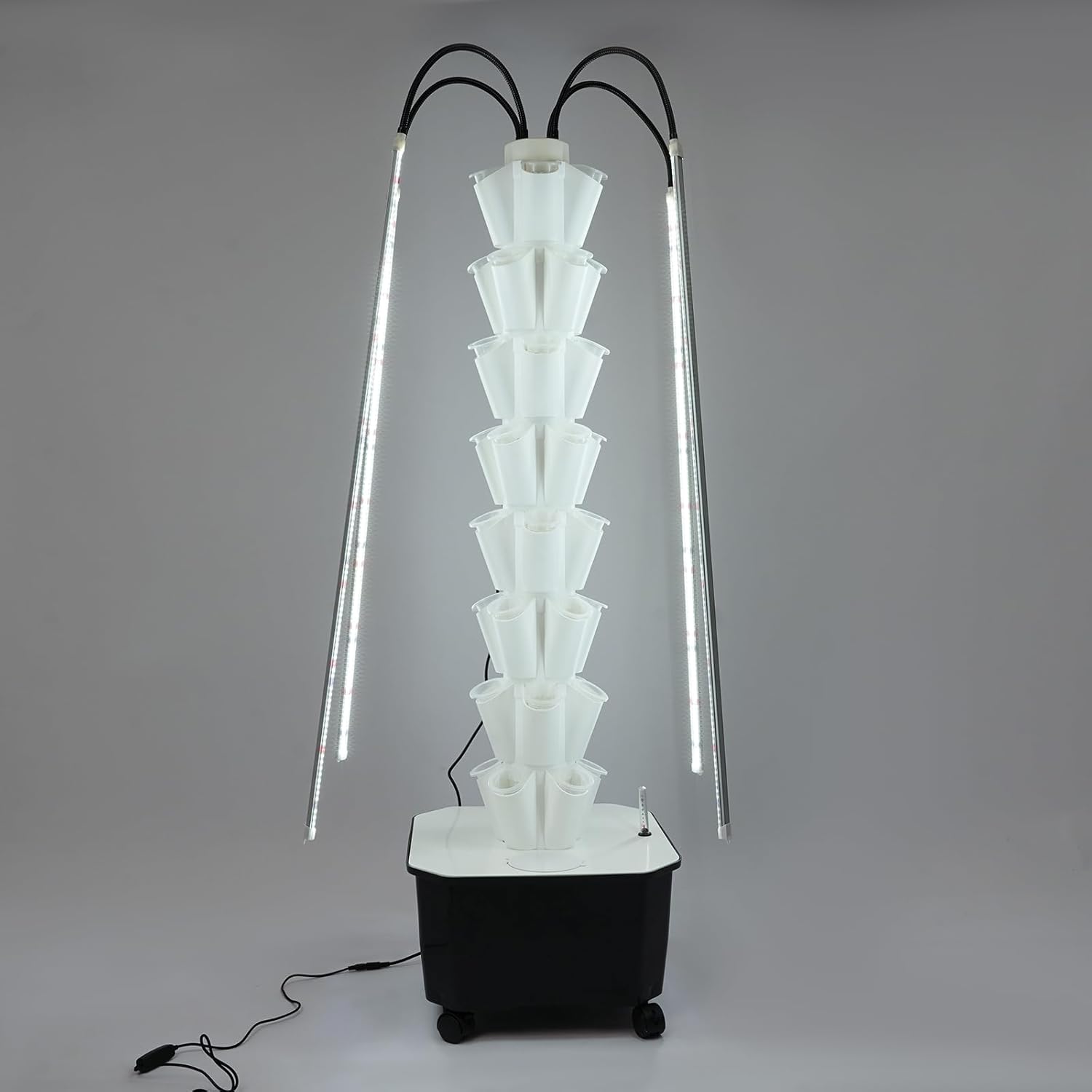 - 【Maximize Your Yield】: Go vertical with eight levels of growing space and 40 planting sites. This design lets you grow more plants in less space. Plus, the included grow lights provide 360-degree illumination, ensuring your plants thrive, even on cloudy days.