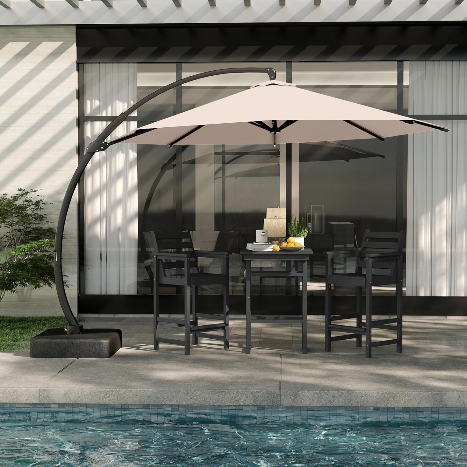 3-Piece Outdoor Bar Set with Beige 11FT Cantilever Umbrella, HDPE Tall Balcony Adirondack Chairs and Table, Outdoor Bar Stools for Patio (Black)
