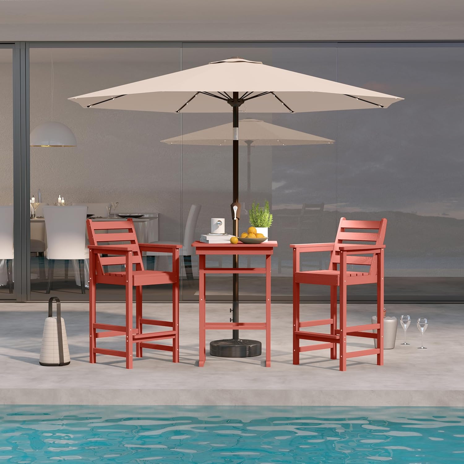 3-Piece Outdoor Bar Set with Beige 9FT Patio Umbrella, HDPE Tall Balcony Adirondack Chairs and Table, All-Weather Outdoor Bar Stools for Patio (Terracotta)