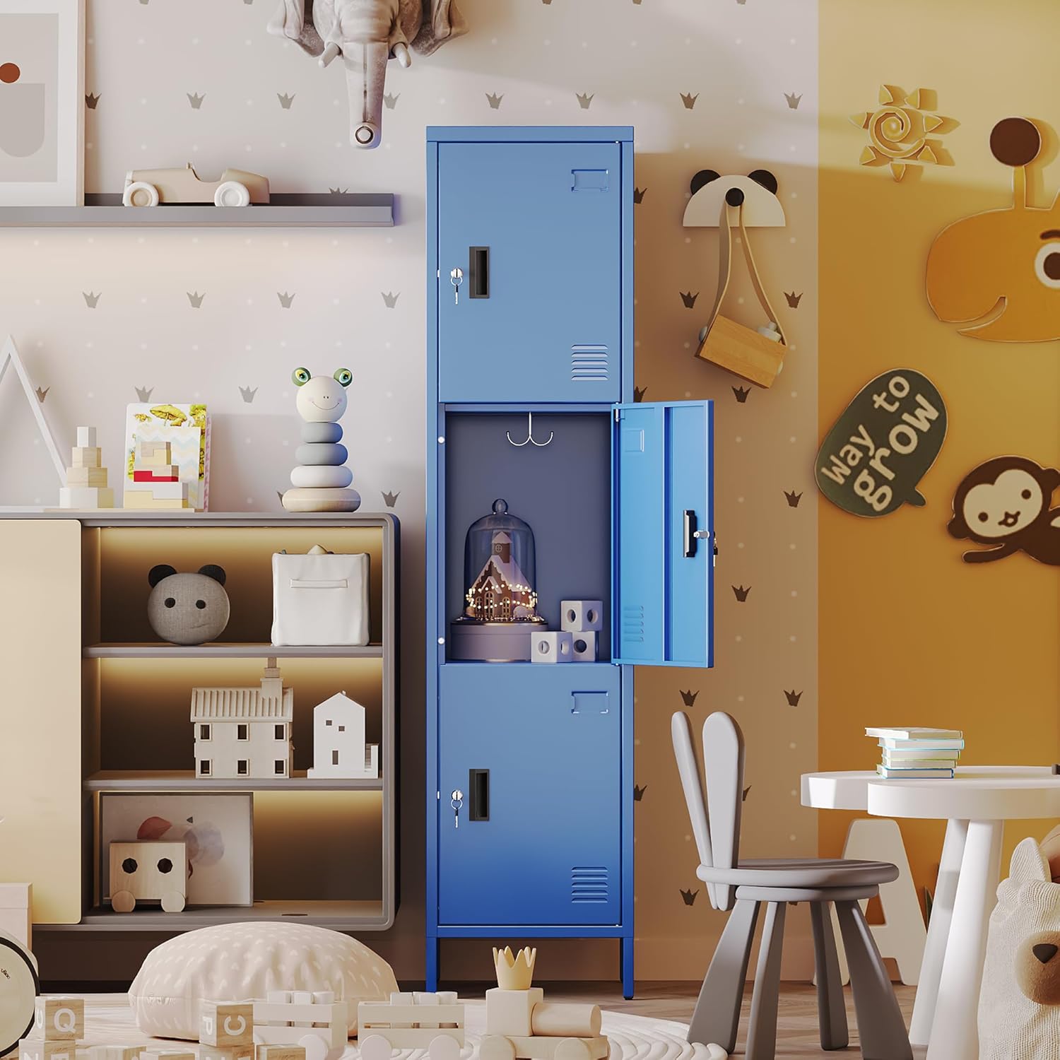 METAN Metal Storage Employees Lockers with 3 Lockable Doors and Hooks,66''H*16''W*16''D Locking Storage Cabinets for Small Spaces,Home,School,Gym,Assembly Required,Blue
