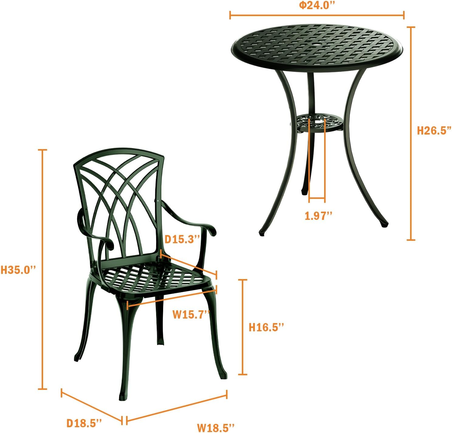 - ăDurable Cast AluminumăMade of anti-rust, weather-resistant cast aluminum, making bistro set perfect for long-term outdoor use in any climate