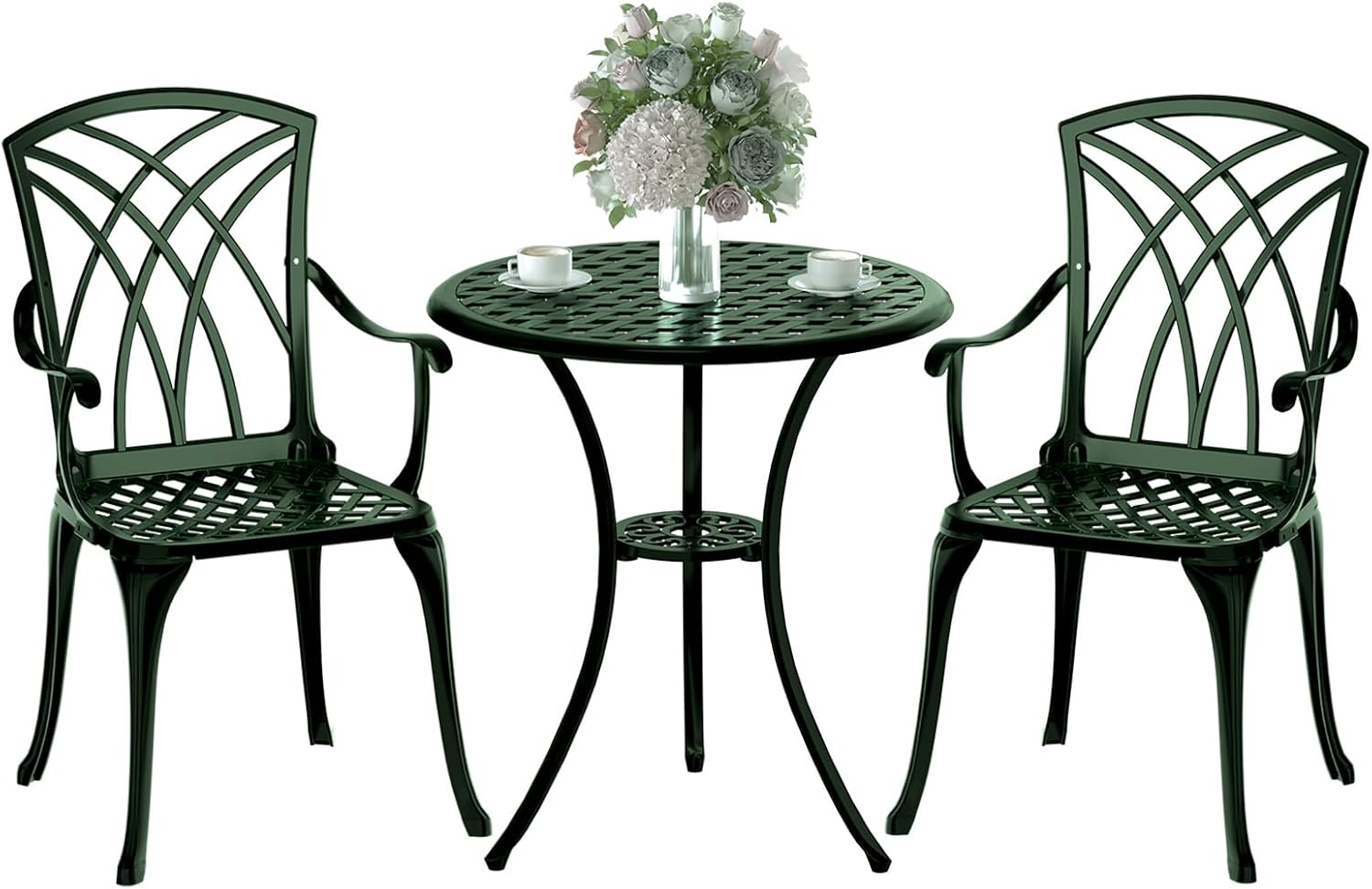 Patio Bistro Set 3 Piece, Cast Aluminum Bistro Set for 2 w/Umbrella Hole, Outdoor Table and Chairs Set of 2, Bistro Set for Balcony/Backyard/Garden, Green