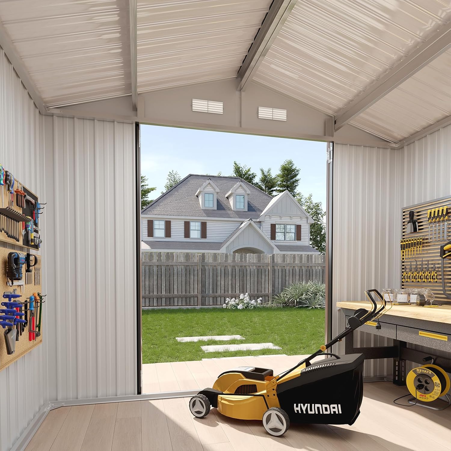 - Heavy-Duty Construction for All-Weather Durability: Built to last, this storage shed features a galvanized steel frame with a powder-coated finish, offering superior rust resistance and UV protection. The rigidly engineered panels withstand heavy loads and adverse weather, while the integrated top vents promote airflow, reducing condensation. The sloped roof design enhances water runoff, and the stainless steel latch lock secures your belongings from theft and pests.
