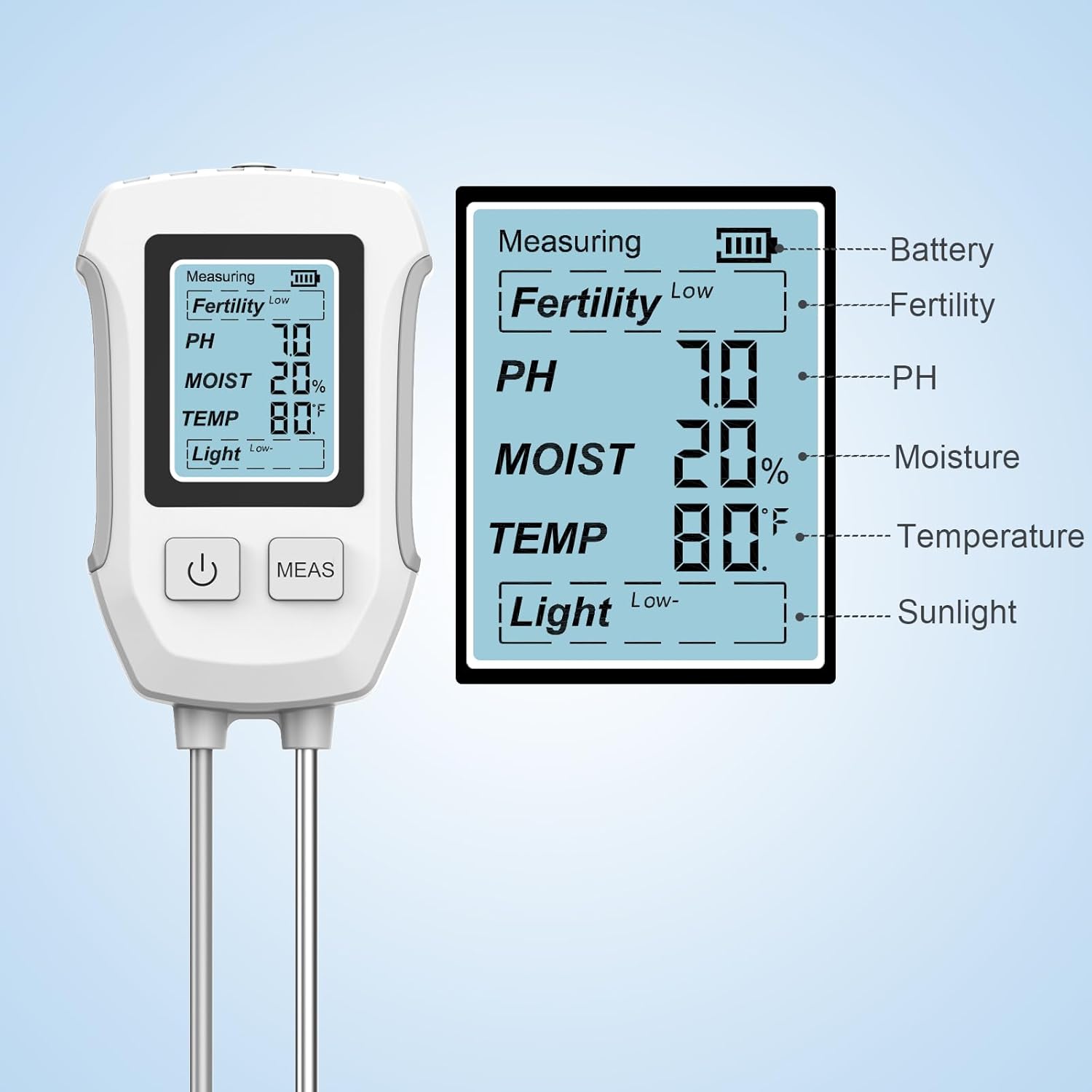- 5-IN-1 SOIL TEST KIT: 2025 upgraded 5-in-1 soil tester measures moisture, pH, temperature, sunlight, and fertility in a single device. No more juggling multiple tools—get a complete soil health analysis at once to optimize plant growth and boost harvest quality.
