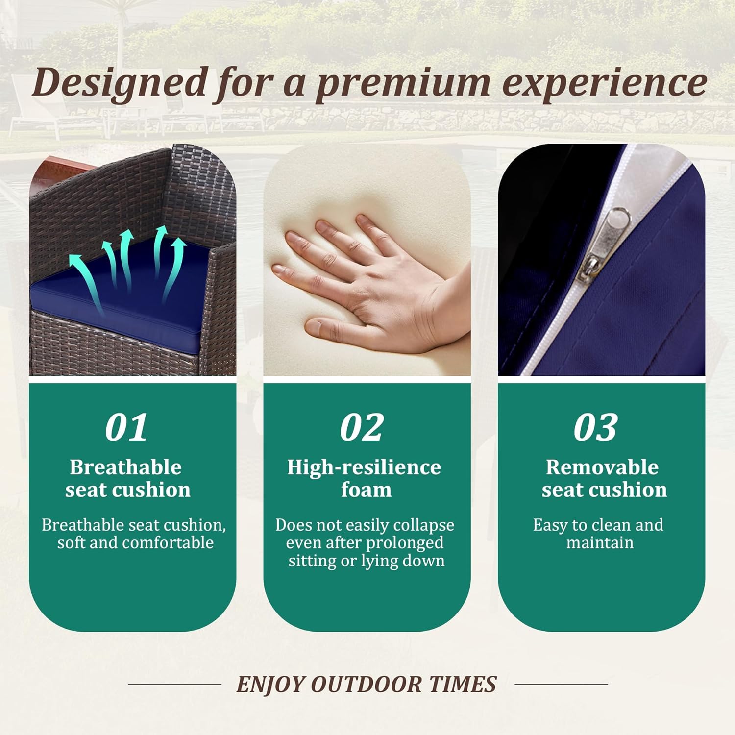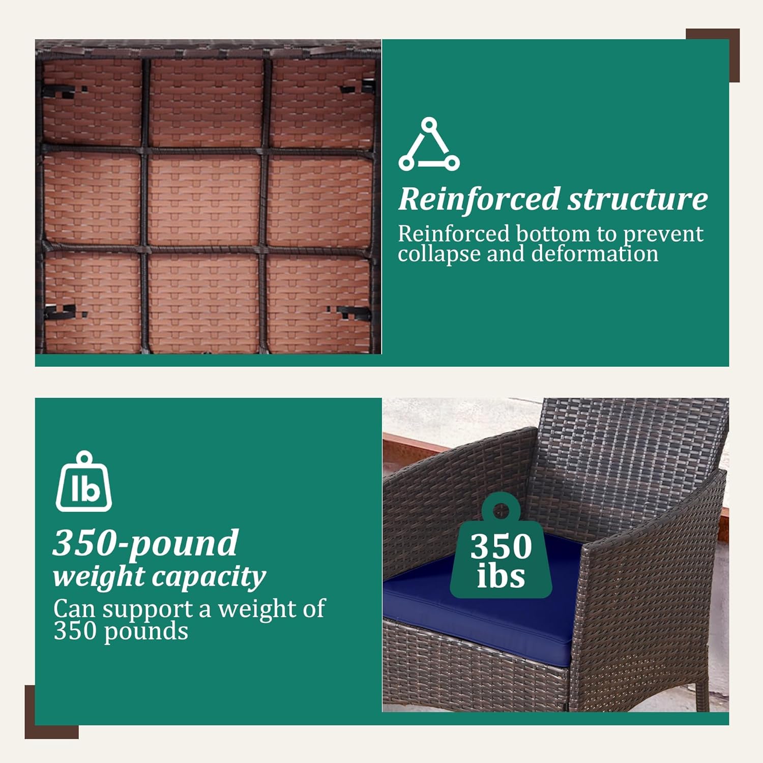 3 Piece Patio Furniture Set - Outdoor Conversation Sets with Coffee Table, Rattan Chair Set for Garden/Poolside, Brown/Navy Blue