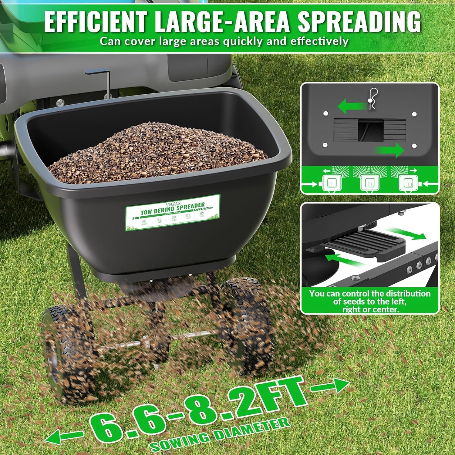 - 【High-capacity Hopper】-Say goodbye to constant refills! Our tow-behind spreader features a rugged 200 lb. poly hopper—rust-proof, dent-resistant, and built to handle large jobs with ease. Perfect for seed, fertilizer, ice melt, and more, it covers up to 50,000 sq. ft. per load, saving you time and effort on expansive lawns or fields.