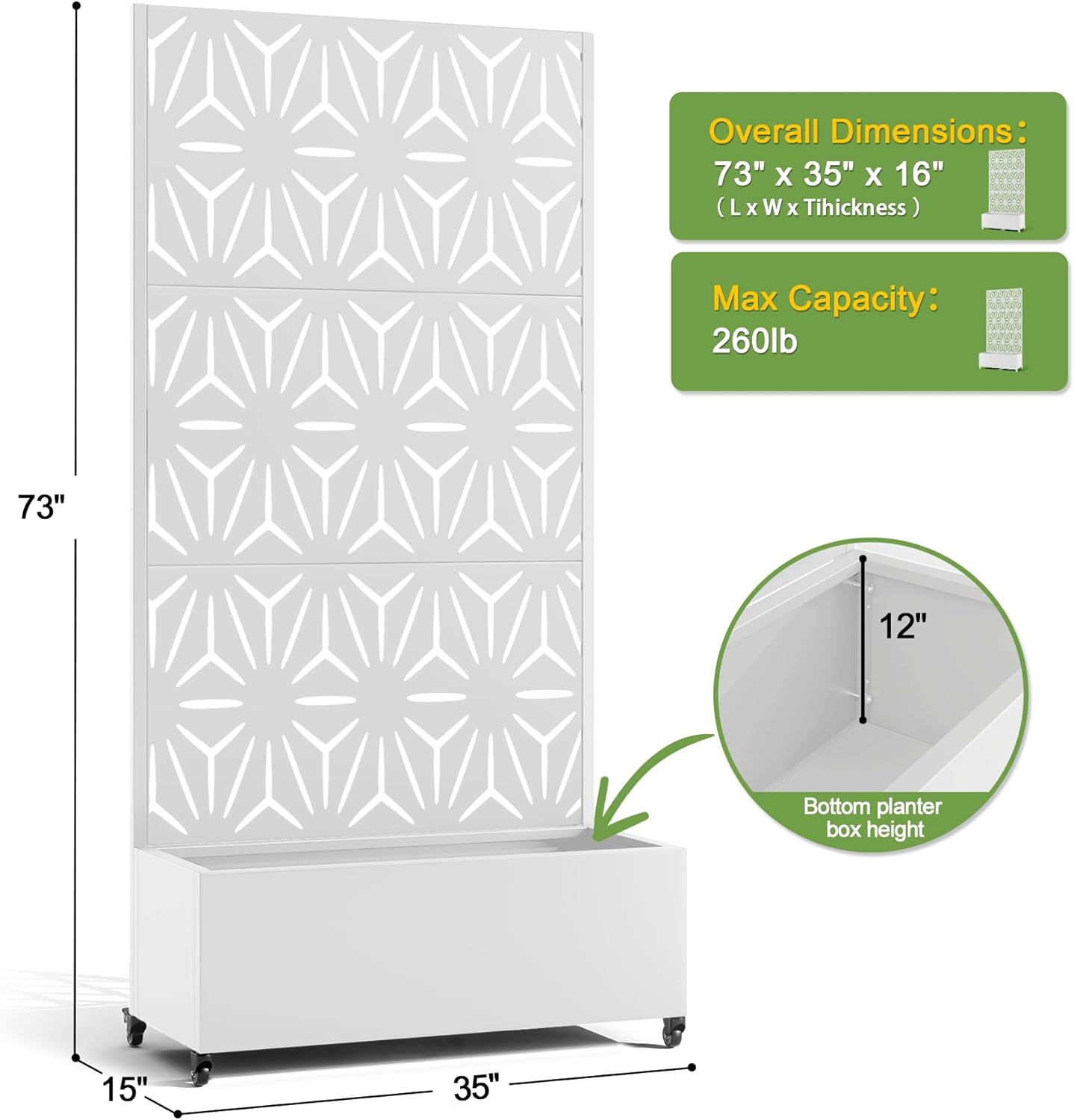 FENCY Metal Raised Garden Bed with Wheels and Trellis,73"x35"x16" Planter Box for Climbing Plants, Vegetables & Vines, Features Privacy Screen and Drainage Holes (White-Star)