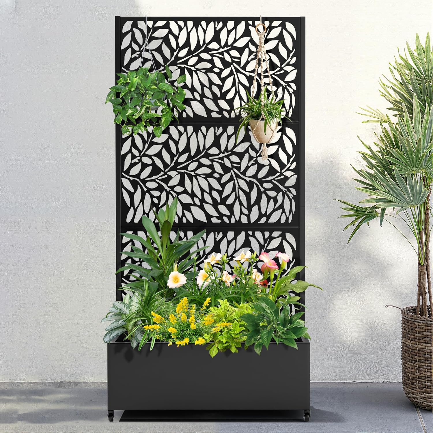 FENCY Metal Raised Garden Bed with Wheels and Trellis,73"x35"x16" Planter Box for Climbing Plants, Vegetables & Vines, Features Privacy Screen and Drainage Holes (Black-Leaf-2)