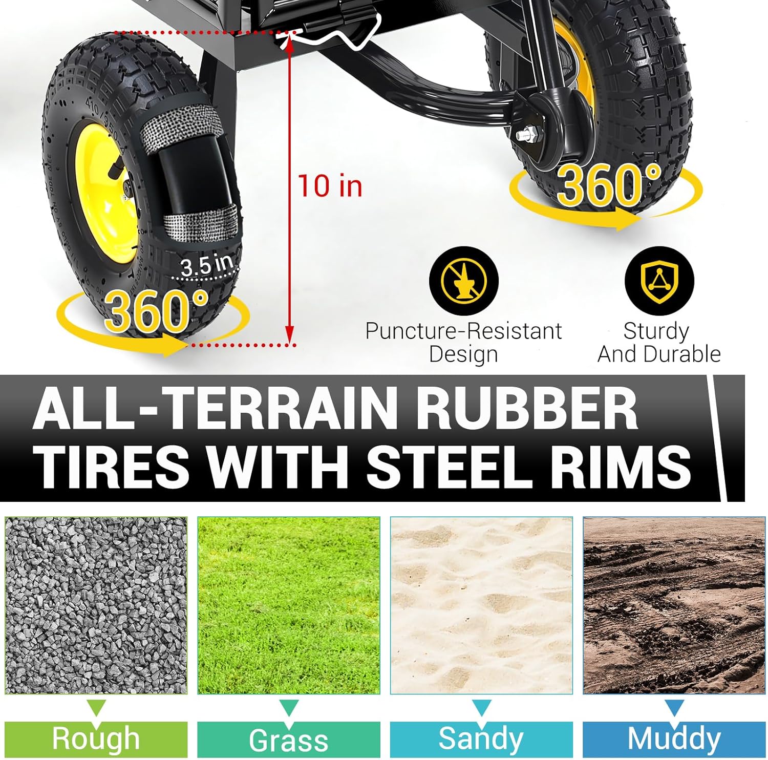 - USER-FRIENDLY SWIVEL HANDLE: The cart is equipped with a 180-degree swivel handle for easier maneuvering. The handle has a rubberized grip, which increases operating comfort and reduces fatigue during prolonged use. This thoughtful design allows you to navigate through tight spaces and corners with ease, making gardening more efficient.