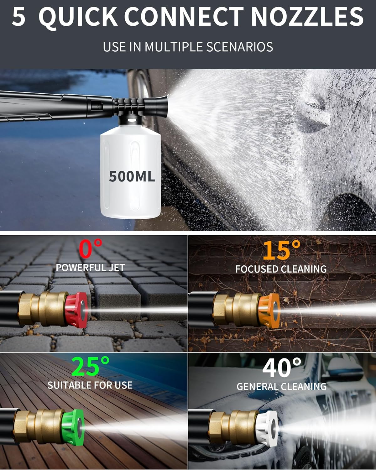 - 7 Versatile Spray Modes: Conquer any job! Includes 6 quick-connect spray tips (0°, 15°, 25°, 40°) plus a detergent tank for light to heavy-duty cleaning tasks.