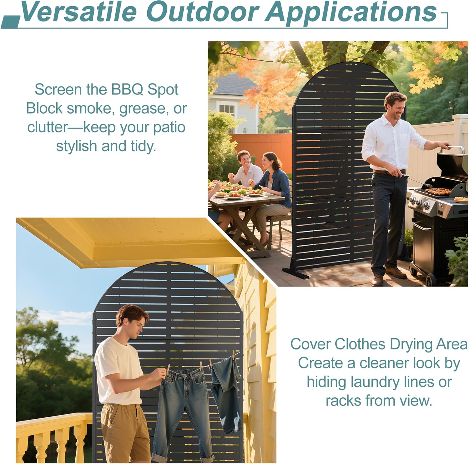 FENCY Metal Privacy Screen with Stand 72" H×47" W Outdoor Freestanding Privacy Panels, Arched Outdoor Privacy Screen for Deck Patio Balcony(Black-Louvered)