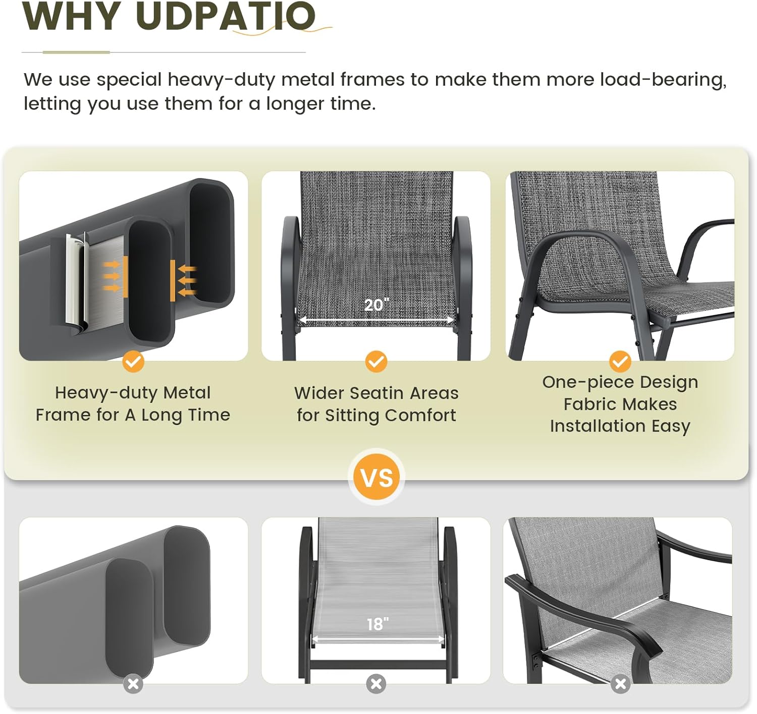 - 【WIDER SEAT & HIGH BACK】Our patio dining chairs are 20 inches wider than traditional 18-inch seating. It also features an ergonomic high back structure. The comfortable width of the chair seat and the contoured backrest make your leisure time more comfortable