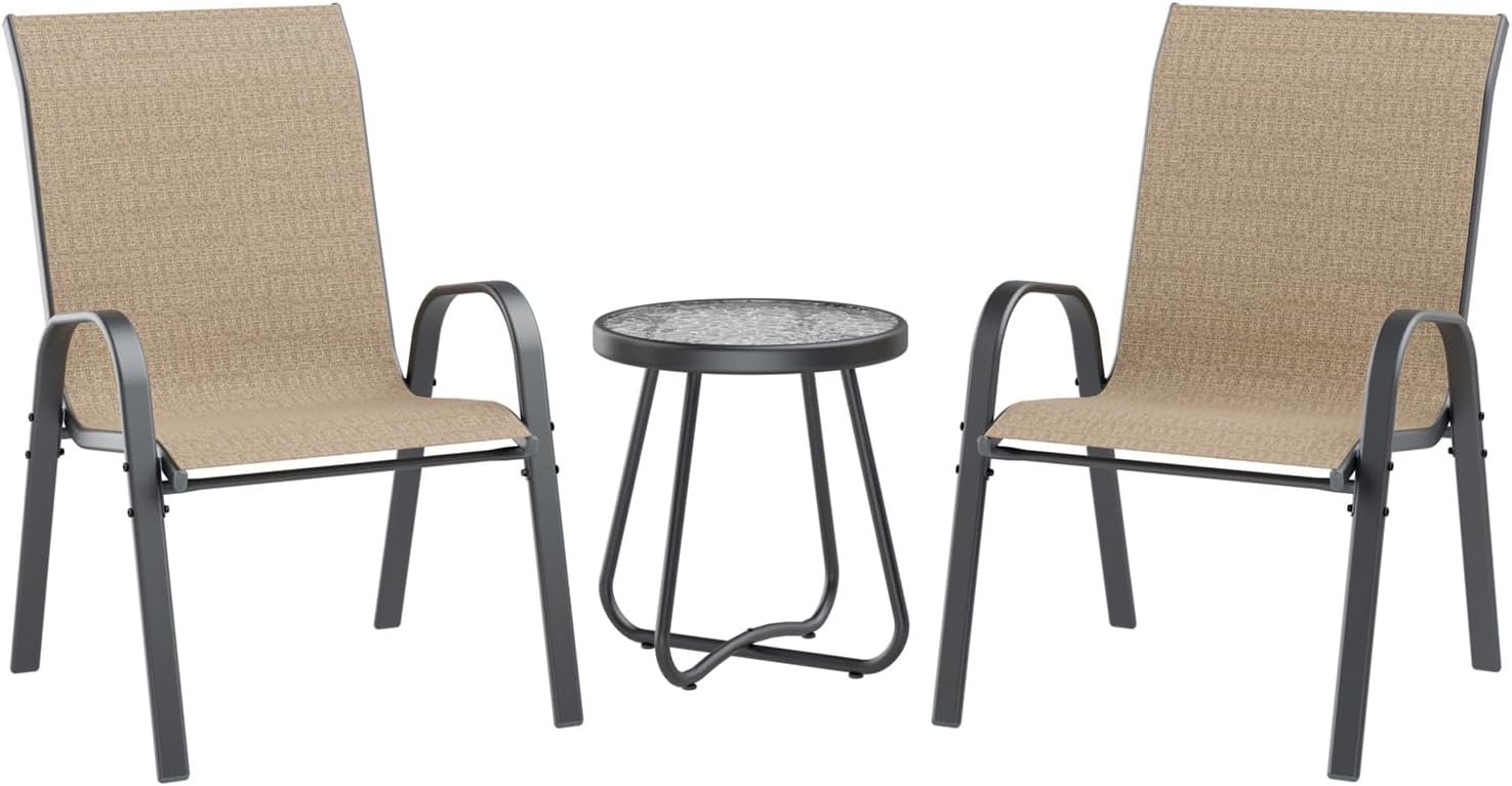 UDPATIO Patio Dining Set of 3, Outdoor Table and Chairs Set with Glass Table, 2 Stackable Patio Chairs with High Back, Outdoor Furniture Sets for Deck Garden Backyard Lawn Poolside (Brown)