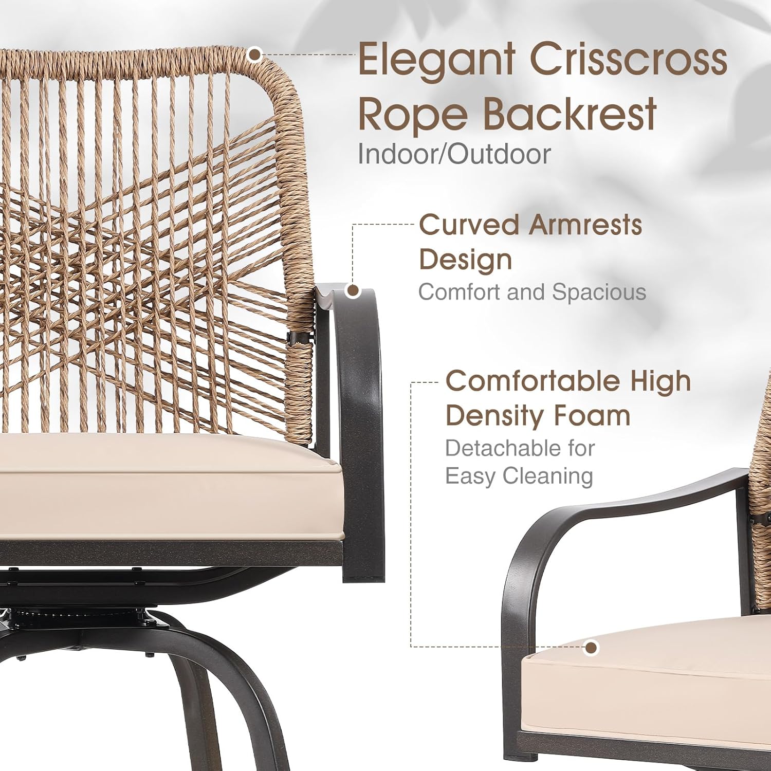 - STURDY CONSTRUTION:The swivel bar chairs are made with sturdy iron frame covered with PE rope and sturdy metal leg.Durable bar height stools with a weight capacity of up to 250 pounds for every season