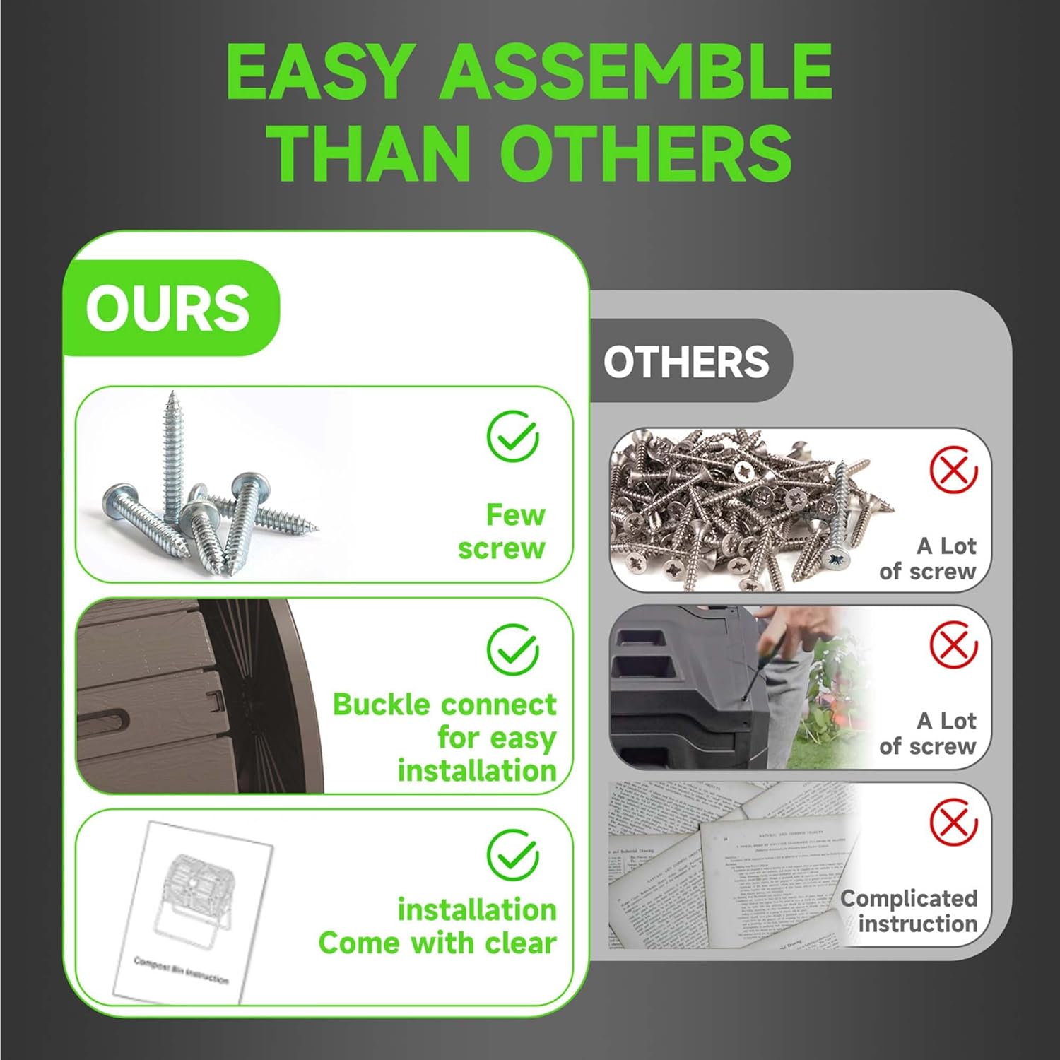 - 360° Rotating Design - The 360° rotating design eliminates the need for manual mixing or digging. The eight-panel deep fin structure provides a better grip, making it easier to turn the compost bin while also breaking up clumps for more consistent and efficient composting, speeding up decomposition with minimal effort.