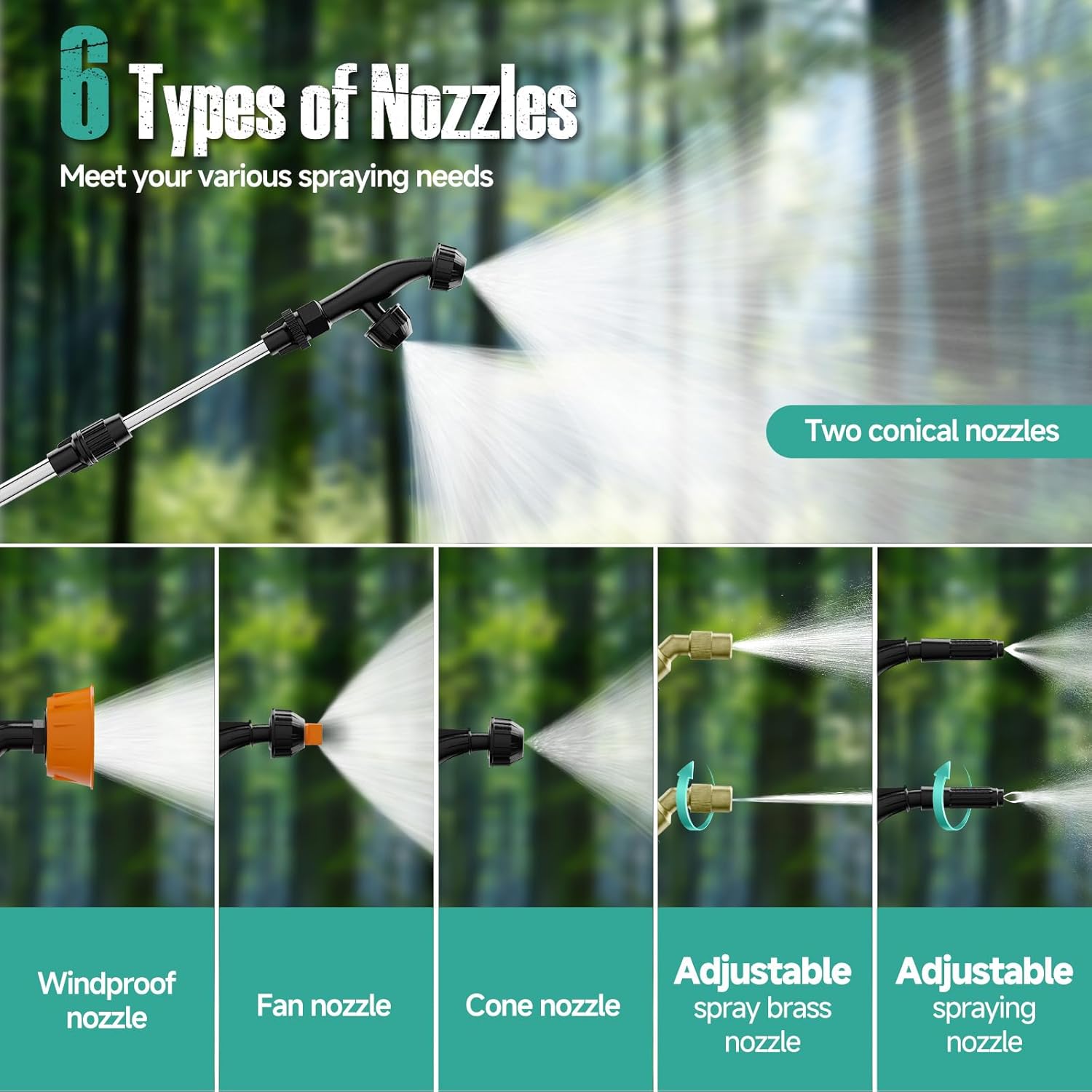 - 【6 Nozzles with Adjustable Spray Patterns】KIMO battery backpack sprayer comes with 6 nozzles, including 2 adjustable nozzles that let you customize the spray from a fine mist to a coarse stream. This versatility makes it perfect for a wide range of tasks—whether you're tending to delicate plants or tackling hardy vegetation. The adjustable nozzles can be easily switched with one hand, allowing you to adapt quickly without interrupting your workflow