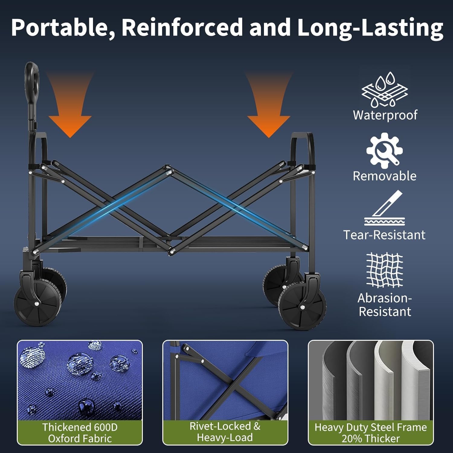 - Heavy-Duty 380LBS Load Capacity & Spacious 220L Storage:Engineered with a reinforced heavy-duty steel frame and tear-resistant 600D Oxford fabric, this wagon cart effortlessly handles up to 380 lbs of gear. The 220L (6.2 cubic feet) cavernous space is large enough for all your groceries, camping equipment, beach essentials, or gardening supplies, making it the perfect heavy-duty foldable wagon for any task.